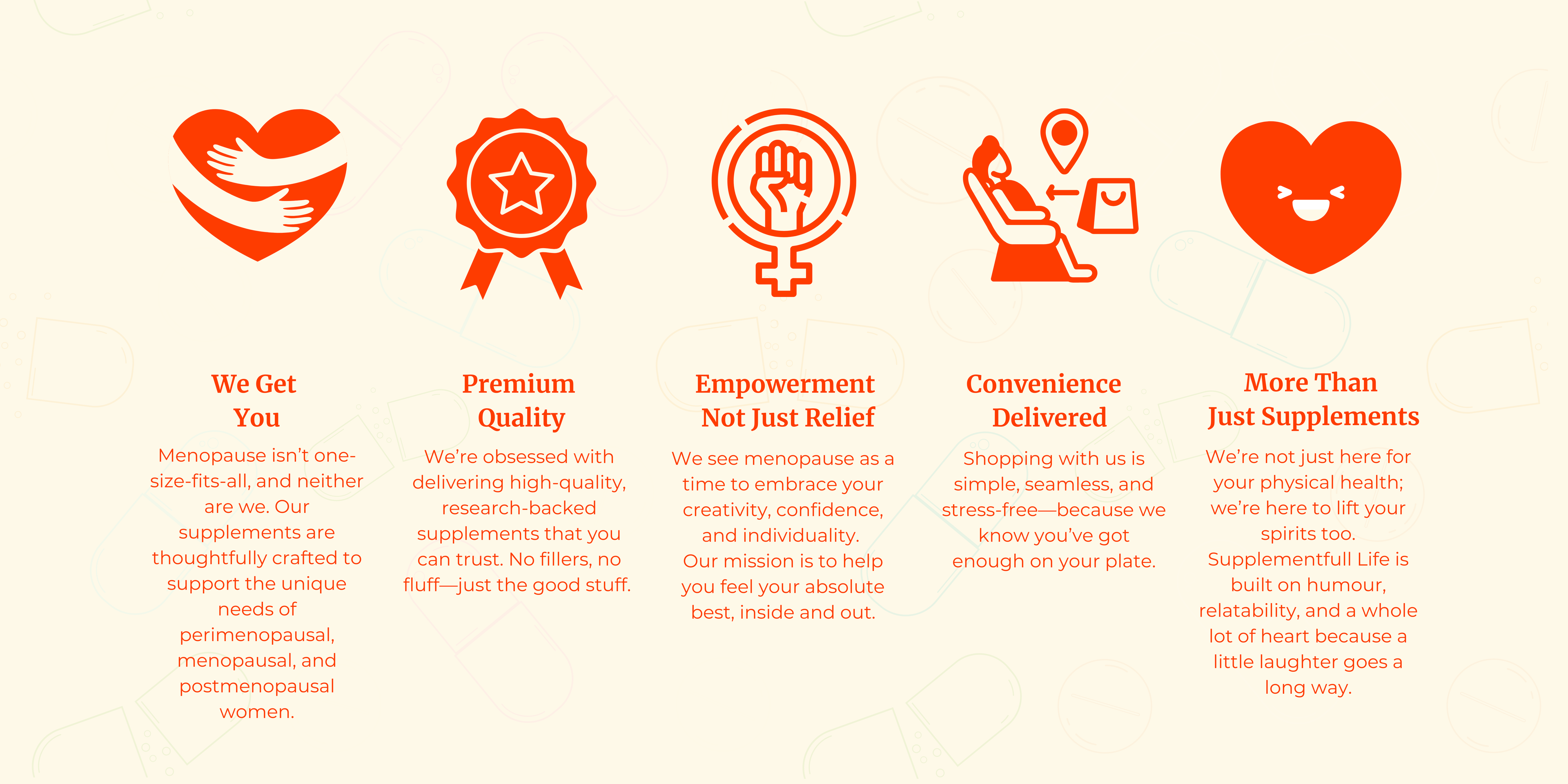 Welcome to Supplementfull Life — natural supplements & smart support for every stage of menopause. We blend sass & soul with science to help you thrive, from brain fog to skin, sleep, & libido.